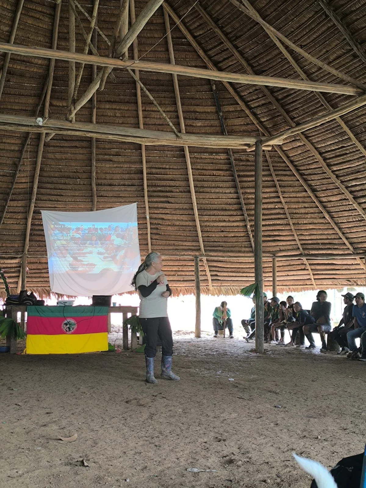 Para el día dos, el amanecer trae consigo la gran energía que caracteriza a mis compañeros indígenas, la fuerza para la grandeza y en sus ojos un brillo incandescente e inagotable. Después de pedir permiso a la selva para poder entrar un poco más en el territorio, nos dirigimos a las chagras para realizar la siembra de plántulas que cada resguardo trajo de su respectiva comunidad. Es una siembra considerable y que solo se puede conmutar con el trabajo en equipo que, siendo sincero, es bastante sencillo con personas que fluyen de una manera tan ligera en este ecosistema. La siembra es un proceso de aprendizaje que va más allá de poner una semilla en la tierra, es herencia ancestral, tiene una manera especial de realizarse en la que se siente el cariño y el respeto que estas personas le tienen a la tierra. Después de la siembra, vienen las capacitaciones, que para mi sorpresa son un eje más que atractivo en el desarrollo del Aula Viva, la gente se emociona, toma nota, y hasta piden que se repita la información. Esta sección es muy importante, debido a su alcance y el conocimiento que transmite a las comunidades, los ayuda, los educa, todo con base en la actualidad de las diferentes acciones gubernamentales que les respectan. Este día no puede terminar sin la mejor parte, las danzas ancestrales realizadas por los niños y adolescentes de la comunidad, es algo que se toman con mucha seriedad y compromiso, porque no solo representa su cultura y herencia, sino que también les da un propósito más grande para representar a su pueblo. La gente se ve muy alegre, las fotos y videos se ven por todas partes, porque ése es el momento especial del día.