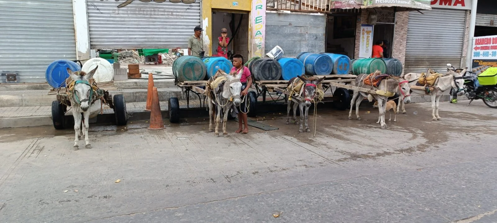 Las carretillas jaladas por burros son el medio más popular de transporte de agua potable en La Guajira.
