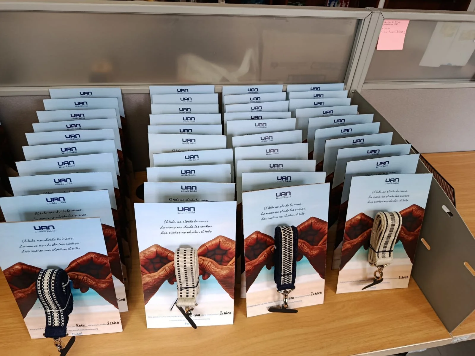 La historia de la Strap Oshonushi Wayuu comenzó a mediados de mayo, cuando tuve la oportunidad de conocer a Alejandra Cruz y María Claudia Coral del Departamento de Relaciones Internacionales de la Universidad Antonio Nariño. Después de compartir con ellas el catálogo de productos que trabajamos con las tejedoras, surgió una propuesta: querían 50 correas tipo strap para celulares como regalo institucional, acompañadas de un empaque biodegradable. Aunque nunca habíamos trabajado en un producto como este, la propuesta nos impulsó a aceptar el reto y comenzar a experimentar con ideas y prototipos.