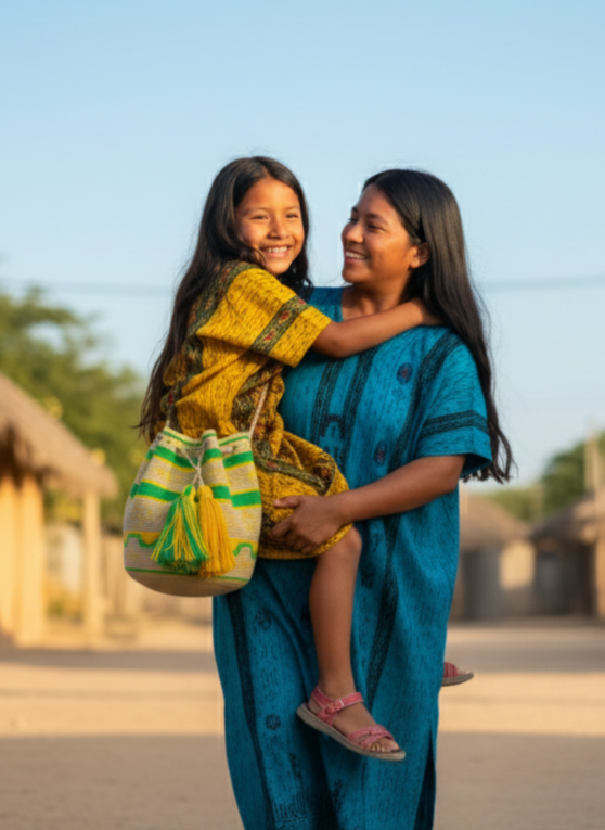 “Cuando yo era muy pequeña, el hambre me puso muy enfermita y me sentía como una ramita seca bajo el sol. Mi mamá tenía mucho miedo y desconfianza, pero los doctores y un joven de la fundación nos ayudaron, y así pude sanar y volver a sonreír. Después, mi mamá aprendió a tejer para darnos un futuro, y ahora ella es una tejedora muy fuerte."